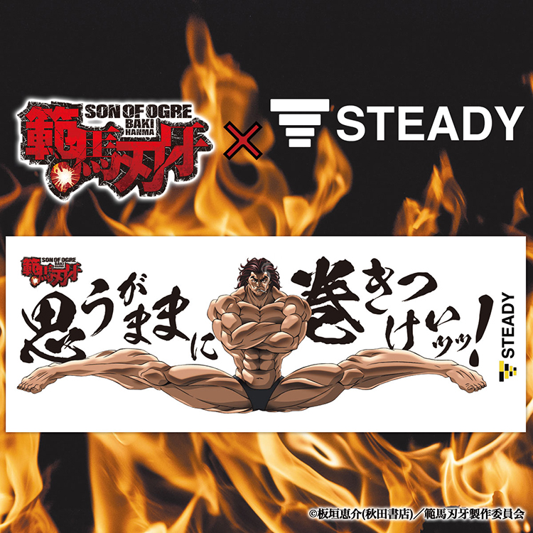 アニメ「範馬刃牙」×STEADY コラボによる「範馬勇次郎オリジナルタオル」。オリジナルタオルには範馬勇次郎の大胆な開脚がプリントされており、飾っても良し、汗を拭うも良しのファン必携アイテム。